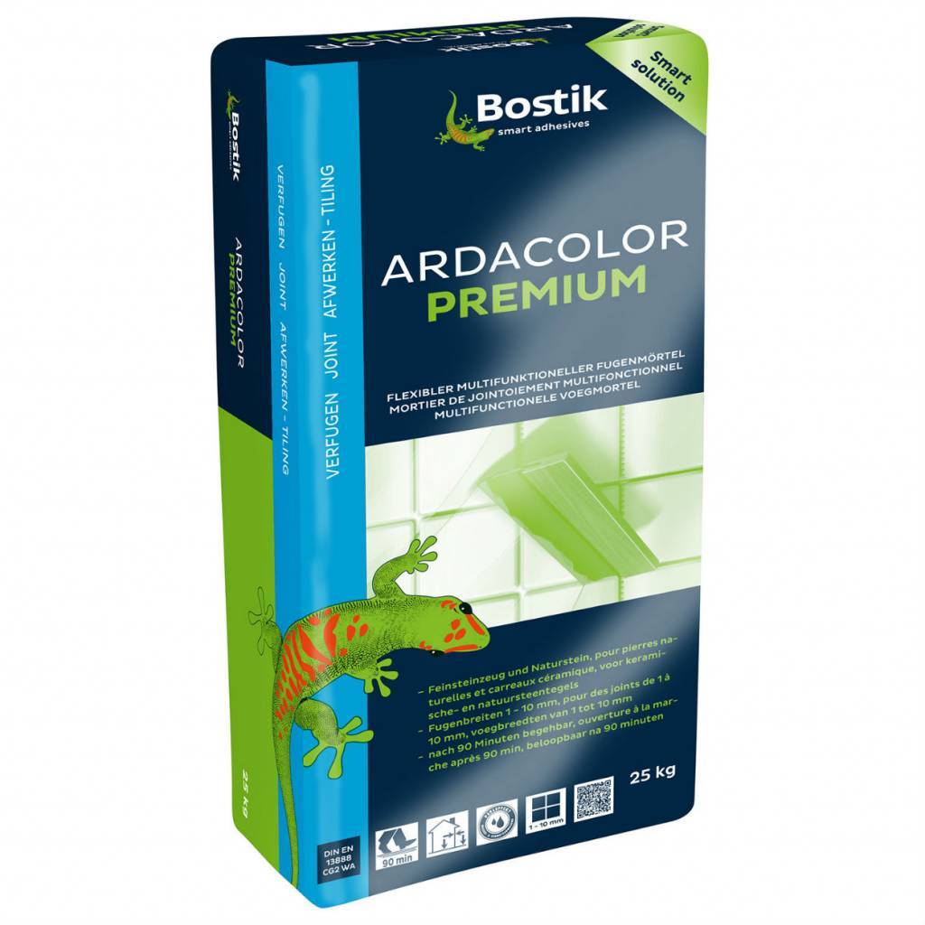 Multifunctionele sneluithardende voegmortel voor alle soorten keramische- en natuursteentegels. Wateren vuilafwijzend met een versnelde uitharding en een verhoogde kristallijne waterbinding. Ardacolor Premium is vorstbestendig, waterdampdiffusie-open en geschikt voor vloerverwarming. In tegenstelling tot normale cementaire voegmortels heeft Ardacolor Premium geen gevaarsymbolen op de verpakking. Ardacolor Premium heeft een verhoogde bescherming tegen microorganismen en schimmelvorming. Voldoet aan CG2 WAnormering volgens EN 13888; is zeer emissiearm volgens GEV-Emicode EC1R PLUS en is chromaatarm volgens EU-VO 1907/2006 (REACH).