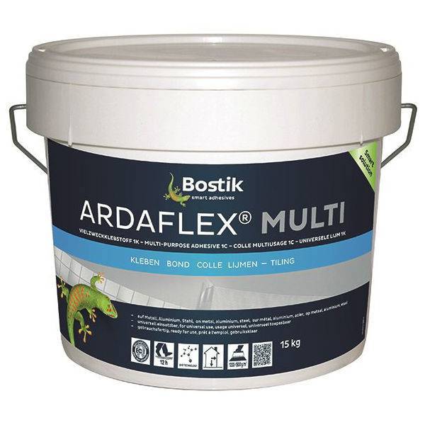 Bostik Ardaflex Multi is een 1-component vochtuithardende universele lijm op basis van SMP-technologie. Ardaflex Multi is hoog elastisch met een hoge aanvangshechting en heeft een goede hechting op niet zuigende ondergronden. Speciaal geschikt voor het verlijmen van keramische tegels op ontvette metalen, aluminium, stalen ondergronden. Ardaflex Multi vermindert het loopgeluid en het contactgeluid in verbinding met keramische tegels. Ardaflex Multi is emissie-arm volgens GEV-EMI-CODE EC1R, oplosmiddelvrij en geurneutraal. Tevens voldoet het product aan de EC1-norm.