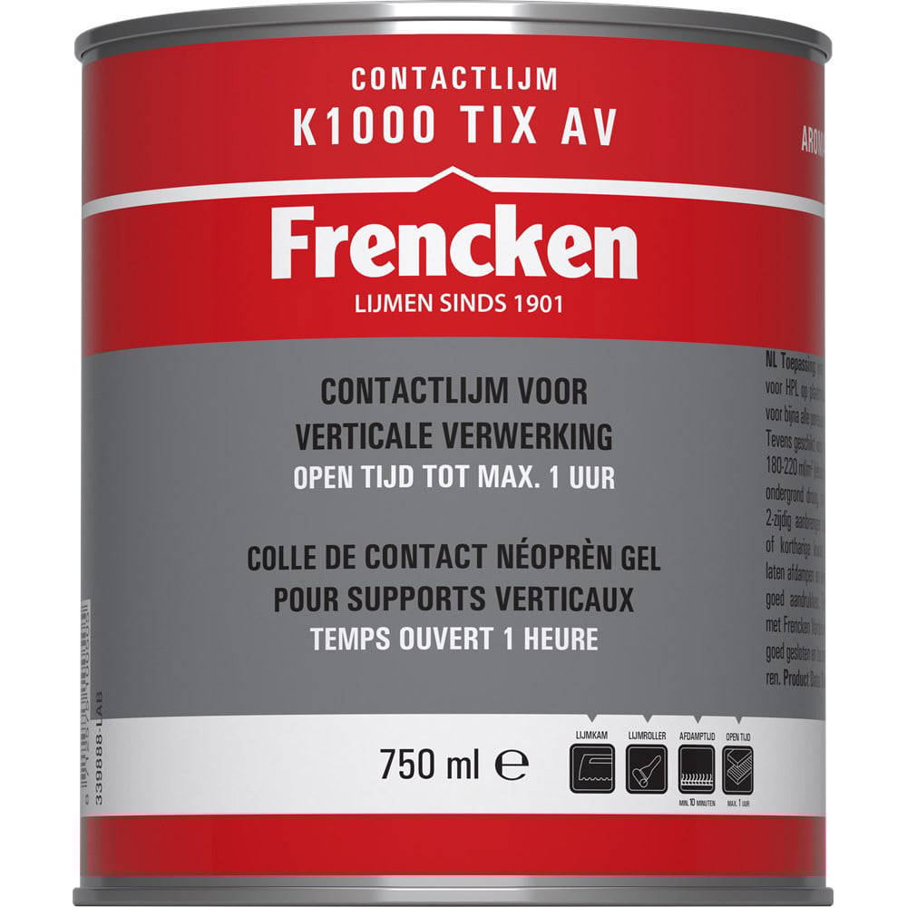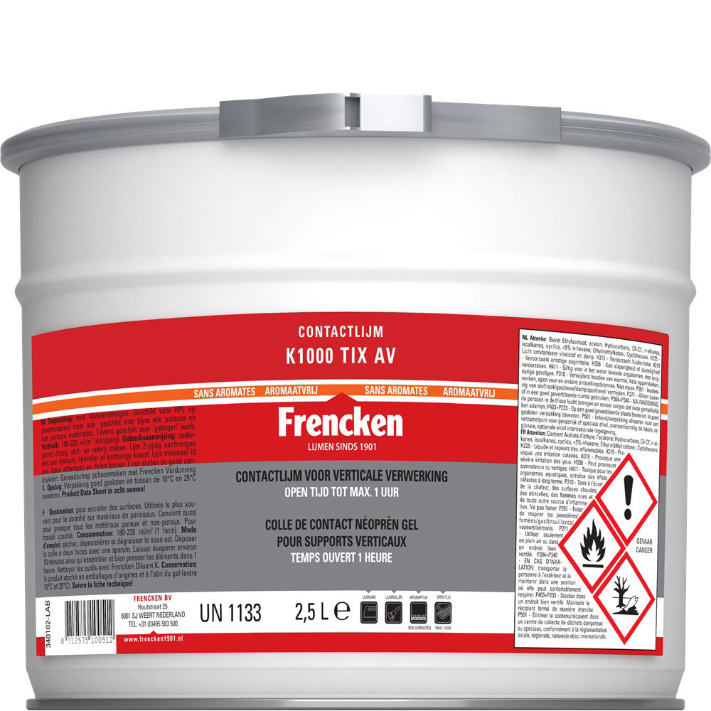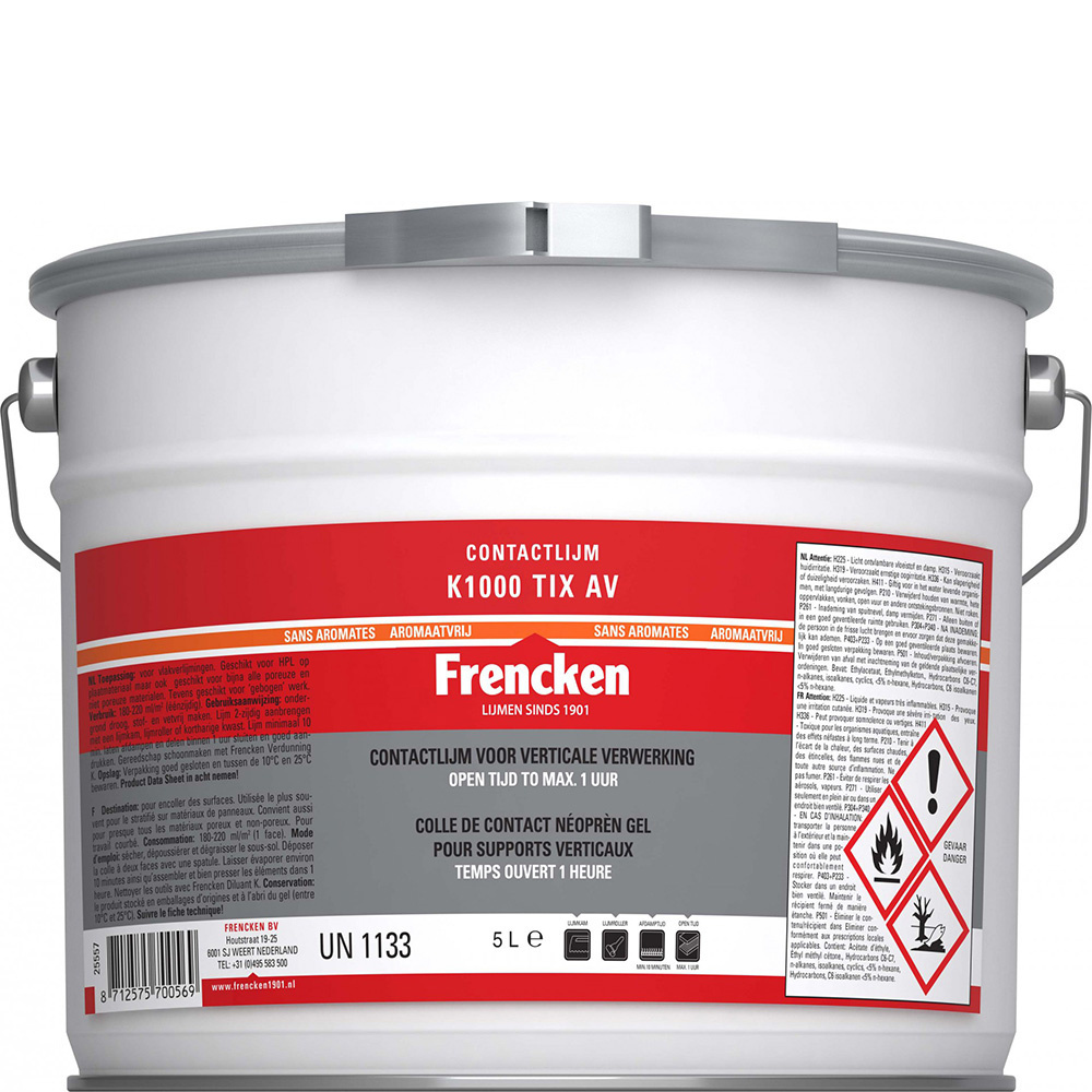 Frencken Contactlijm K1000 Tix AV is een sterke, gebruiksklare contactlijm met thixotrope eigenschappen, ideaal voor verticale en moeilijke toepassingen. De lijm biedt uitstekende hechting op diverse materialen zoals hout, kunststof, rubber en metaal, zonder uit te lopen of te druipen. Dankzij de hoge eindsterkte en snelle krachtopbouw is K1000 Tix AV geschikt voor zowel professionele als doe-het-zelf toepassingen, en garandeert het duurzame, betrouwbare verbindingen bij verlijmingsprojecten.