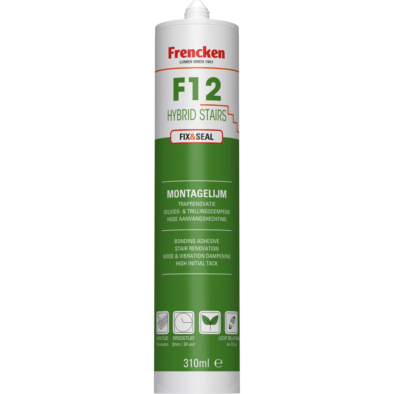 Frencken F12 Hybrid Stairs is een hoogwaardige hybride montagelijm speciaal ontwikkeld voor traprenovaties. Op basis van SMP hybride polymeertechnologie, waardoor het een waterbestendige, elastische en duurzaam sterke verbinding biedt voor massieve trapdelen en aluminium profielen. Dankzij de korte open tijd en snelle belastbaarheid kunnen trapdelen efficiënt en veilig worden gemonteerd zonder klemmen. F12 Hybrid Stairs is eenvoudig te verwerken, vrijwel reukloos, overschilderbaar en zorgt voor een gladde, professionele afwerking met blijvende geluidsdemping.