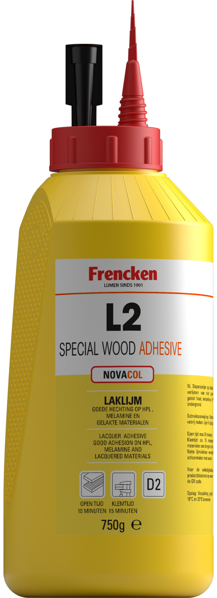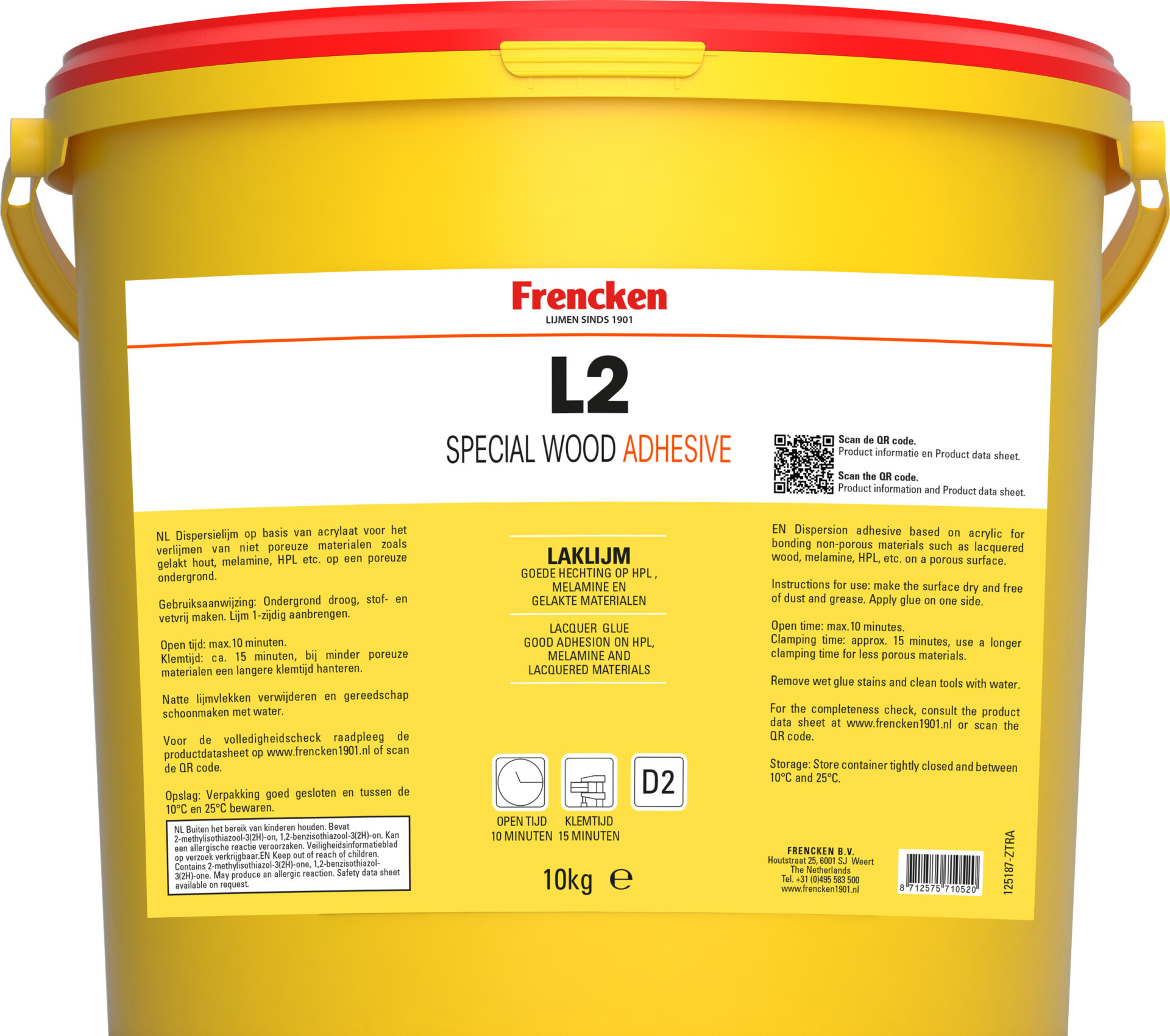 Frencken Laklijm L2 is een hoogwaardige, volledig oplosmiddelvrije lijm speciaal ontwikkeld voor het verlijmen van moeilijk hechtende oppervlakken zoals melamine, HPL, PVC, polycarbonaat en gelakte materialen op houtachtige ondergronden zoals onbehandeld vuren, multiplex, MDF en spaanplaat. De lijm biedt uitstekende hechting, is probleemloos overschilderbaar met alle gangbare lakken en verven, en garandeert een strakke, onzichtbare afwerking. Dankzij de korte pers- en klemtijden van slechts 15 minuten kunnen projecten snel en efficiënt worden afgerond, terwijl de eenvoudige applicatie met kwast, lijmkam of roller zorgt voor gebruiksgemak bij zowel professionals als doe-het-zelvers.