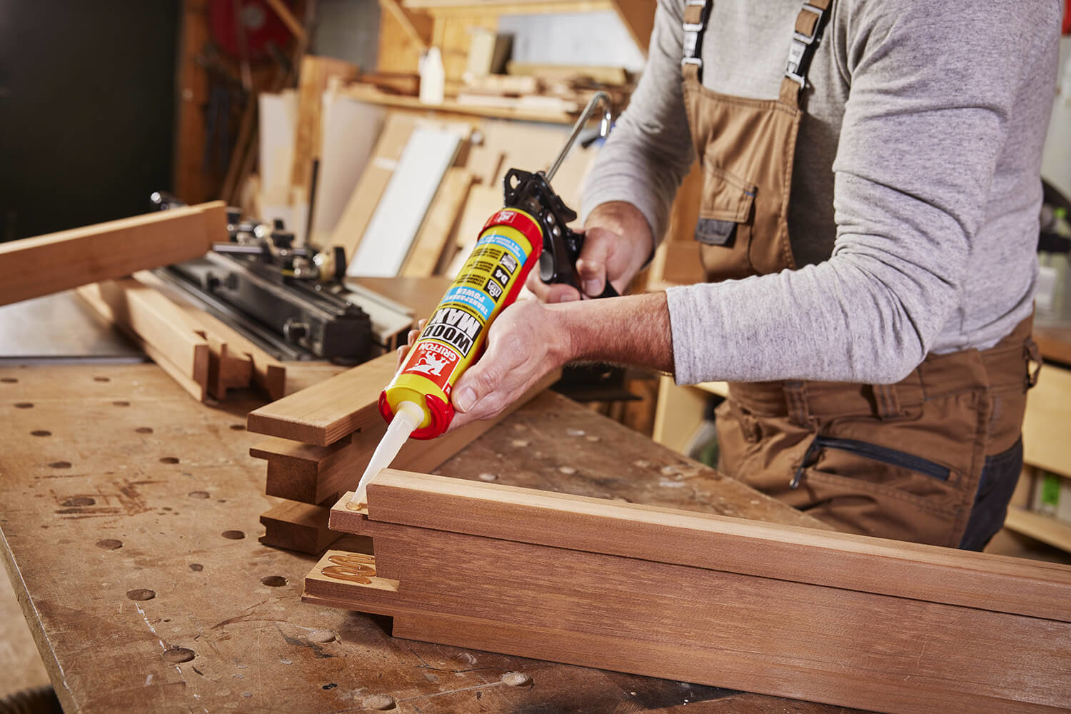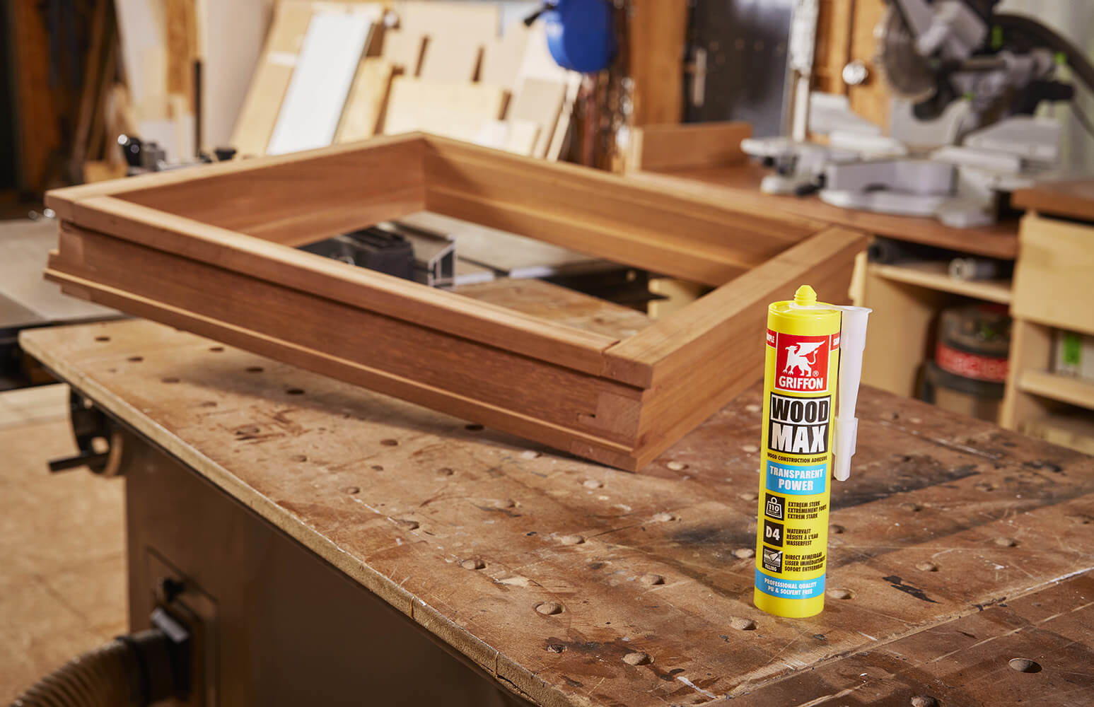 Extreem sterke, snelle, watervaste, di-isocyanaatvrije en vullende houtconstructielijm van het merk Griffon, op basis van SMP-Polymer.